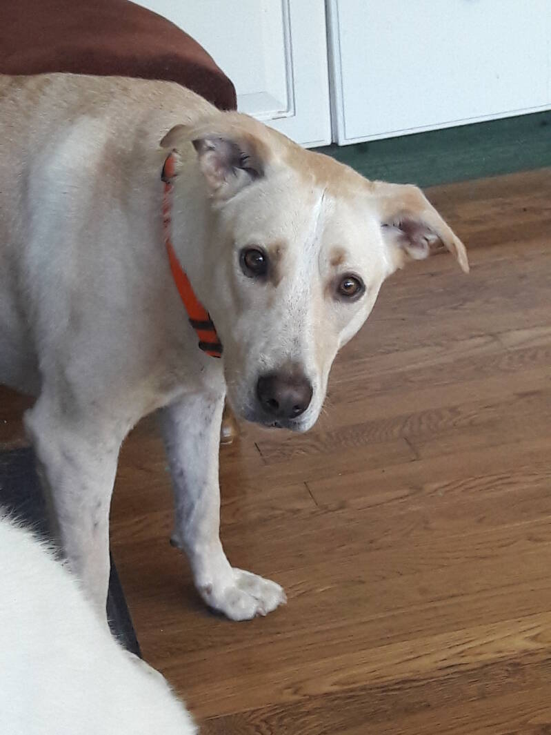 Buddy, a blonde labrador retriever, a rescue from the city of Arlington dog shelter, July 2018, unknown origen